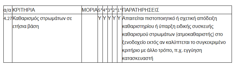 Η Αναβάθμιση του 4.27 Καθαρισμός στρωμάτων σε ετήσια βάση, από ΠΡ: (Προαιρετικό βαθμολογούμενο κριτήριο) με 100 Μόρια, αντικαθίστανται ως εξής: όπως το Κριτήριο 4.27 Καθαρισμός στρωμάτων σε ετήσια βάση σε Υ (Υποχρεωτική προδιαγραφή) , όπου πέραν των άλλων, οι αλλαγές περιλαμβάνονται αναλυτικά στον πίνακα .